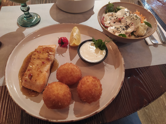• 4. variants: Cepta laša fileja ar kartupeļu kroketēm, parmezāna mērci un salātiem - [pamatēdiens] - 14.20 €/pers.;