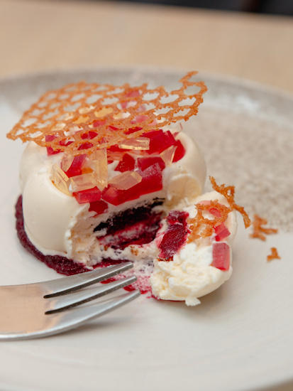 • 6. variants: Skābā krējuma - mandarīnu parfē (piparkūku drumstalas, putukrējums, ķirši, medus cepums, skuju sīrups) - [deserts]