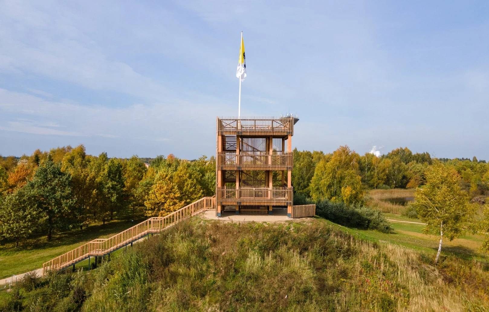 Далее свой экскурсионный путь будем держать в город, только это совсем не означает, что мы отдалимся от природы и ее красот. Прибудем в парк Эйбаришкес и побываем на его башне - это смотровая вышка на искусственном холме для наблюдения за птицами и обзора всего парка. Изучаем ландшафты и пейзажи Литвы! Деревянная смотровая башня высотой 9 метров, которая имеет 3 смотровые площадки на разных уровнях. Для отделки башни были выбраны необструганные деревянные доски, а на вершине их развевается большой флаг с гербом города. С вершины башни открывается вид на территорию парка Эйбаришкю с его водоемами, а вдалеке виднеются постройки Радвилишкиса.